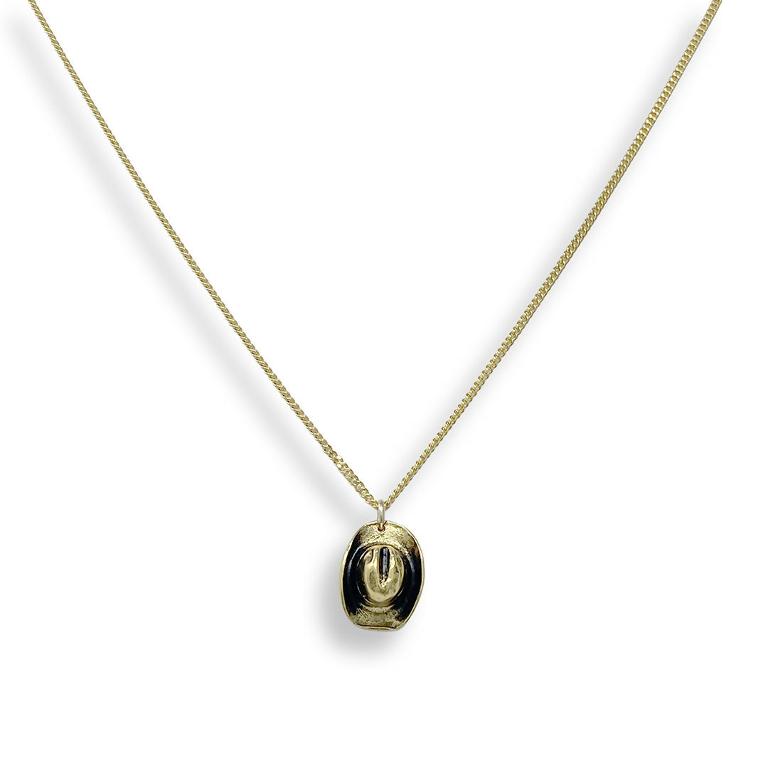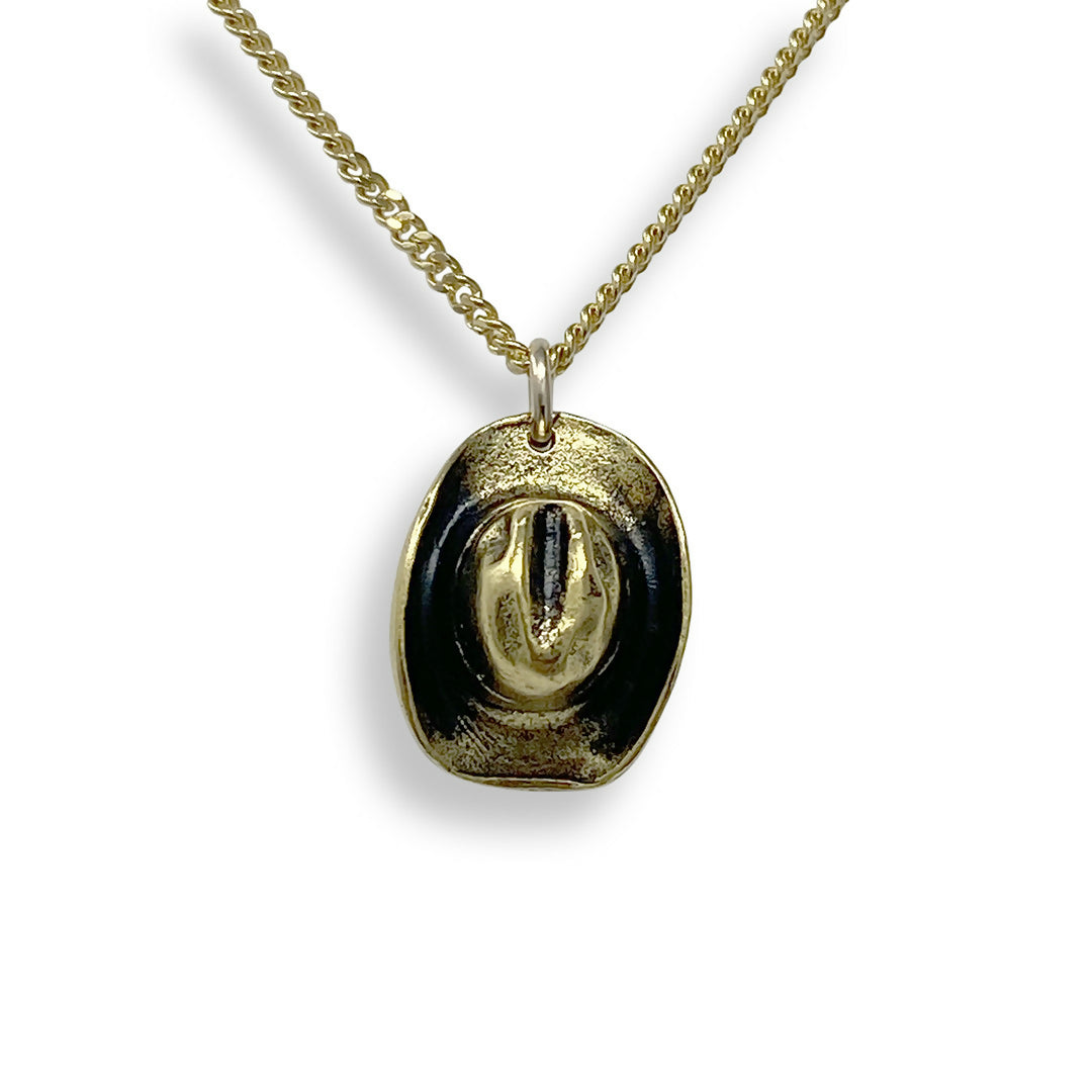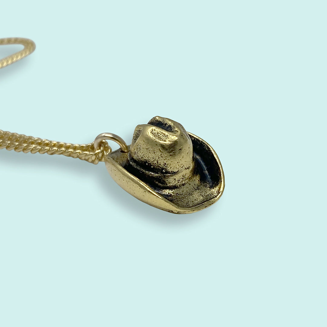 A tiny cowgirl hat pendant (or cowboy hat) on gold curb chain.
