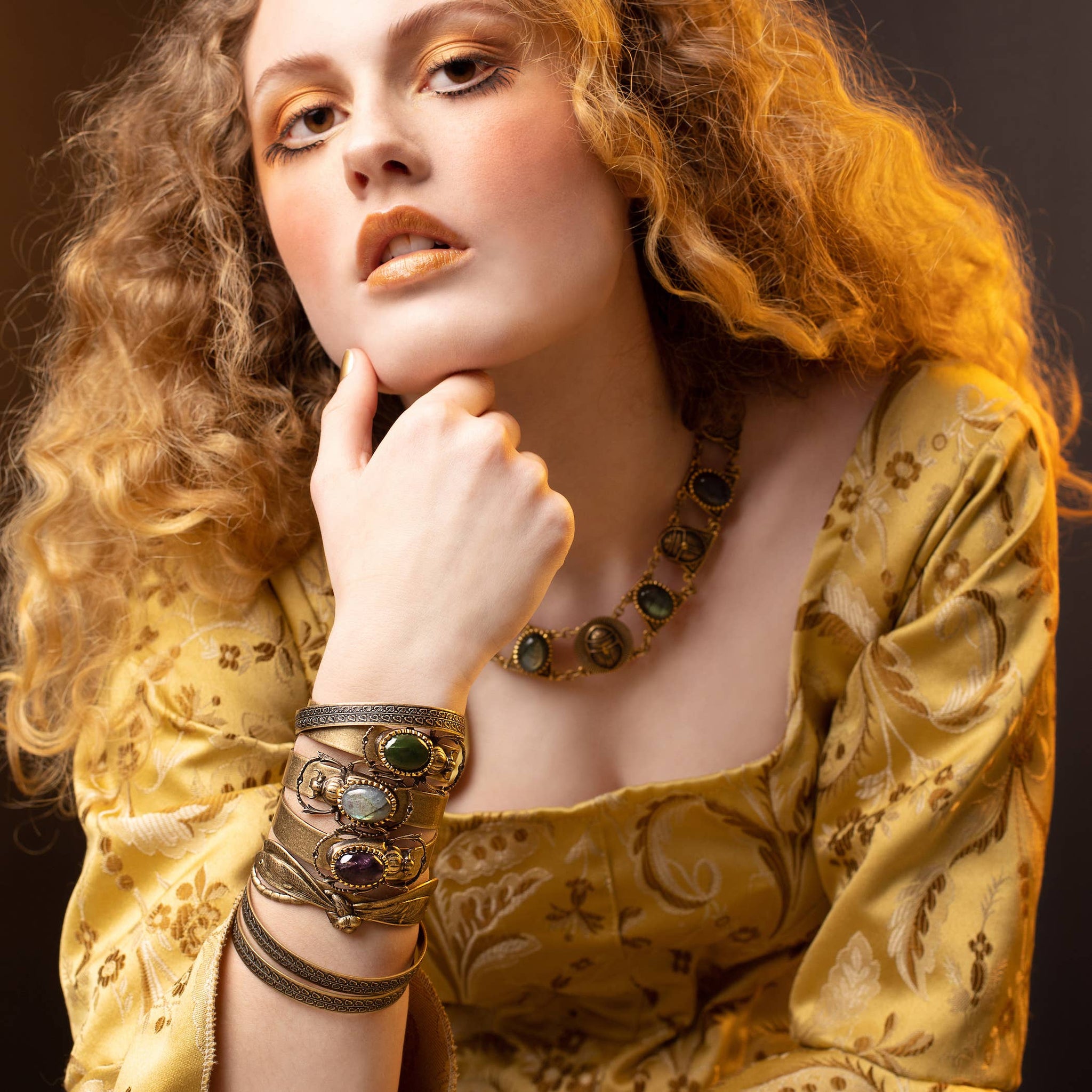The ancient symbol of the scarab, and gemstone cabochons, make up this mystical, adjustable brass cuff. Antique brass Gemstones