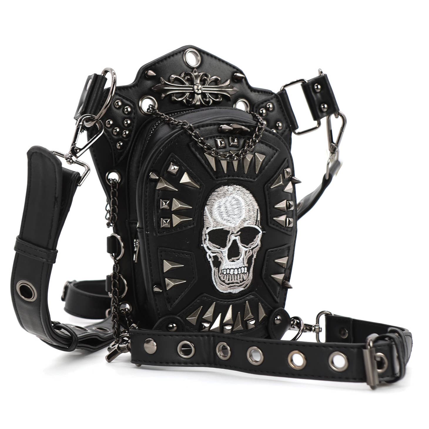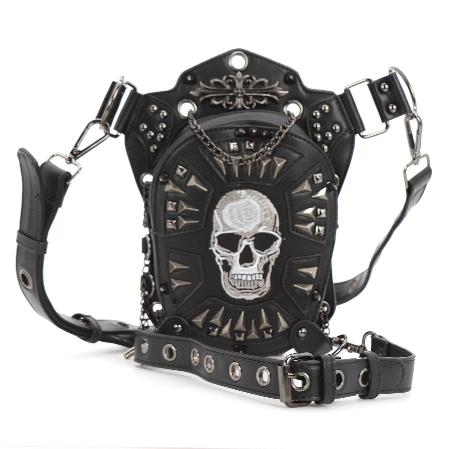 Convertible Skull Design Shoulder Bag/Waist pack FEATURES: High quality vinyl material and uniquely designed, Zippered closure for the main compartment, Fabric lined interior, 1 inside pocket, adjustable crossbody strap, adjustable leg strap.