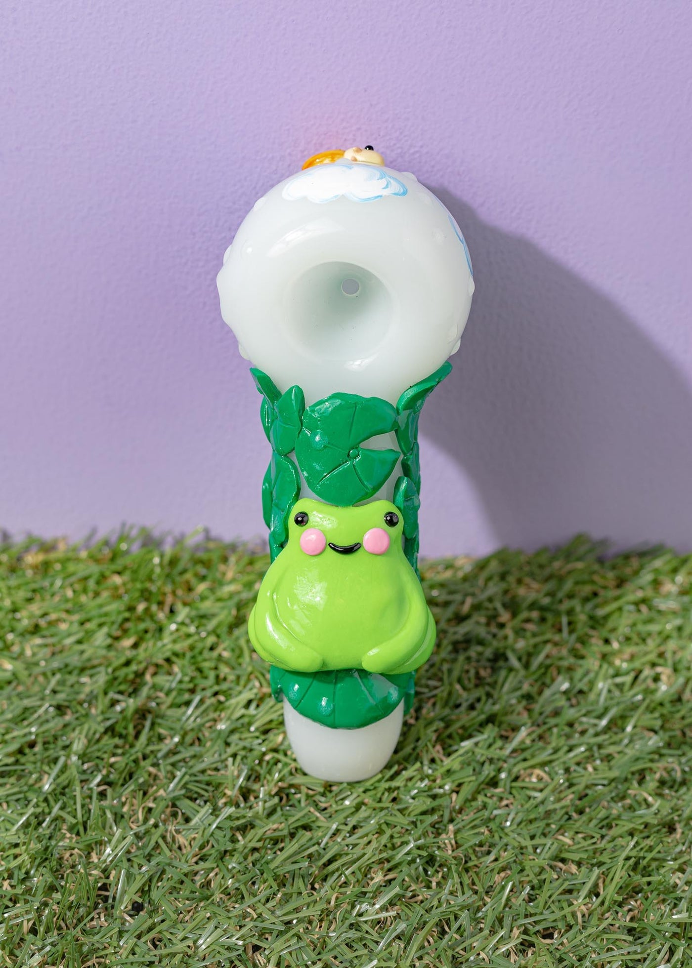 - Featuring a kawaii frog sitting on lilypads on the handle and an adorable snail in a cottage core field on the back head of the pipe