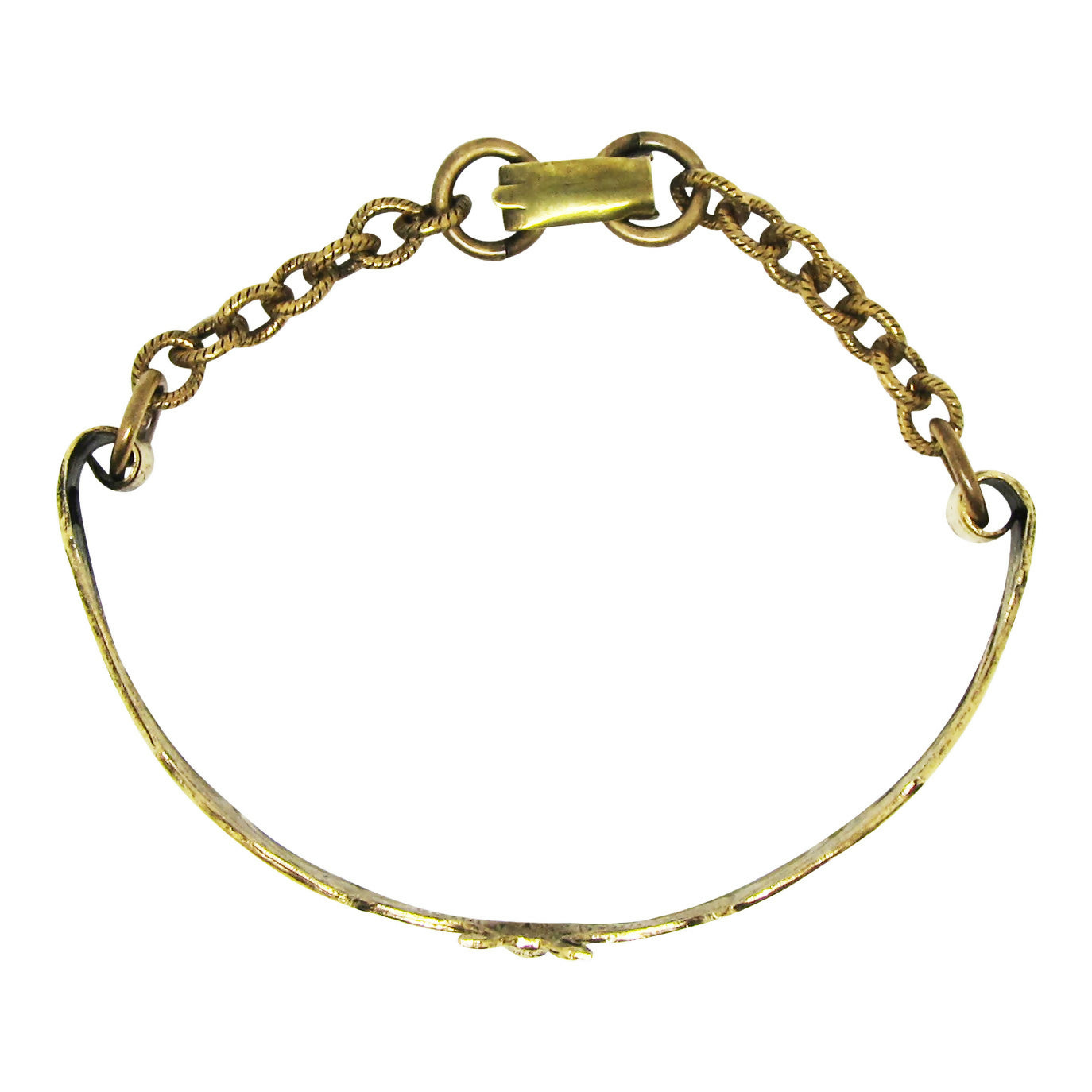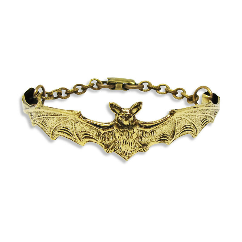 Antique gold bat wraps around your wrist with the help of a patterned antique gold plated chain.