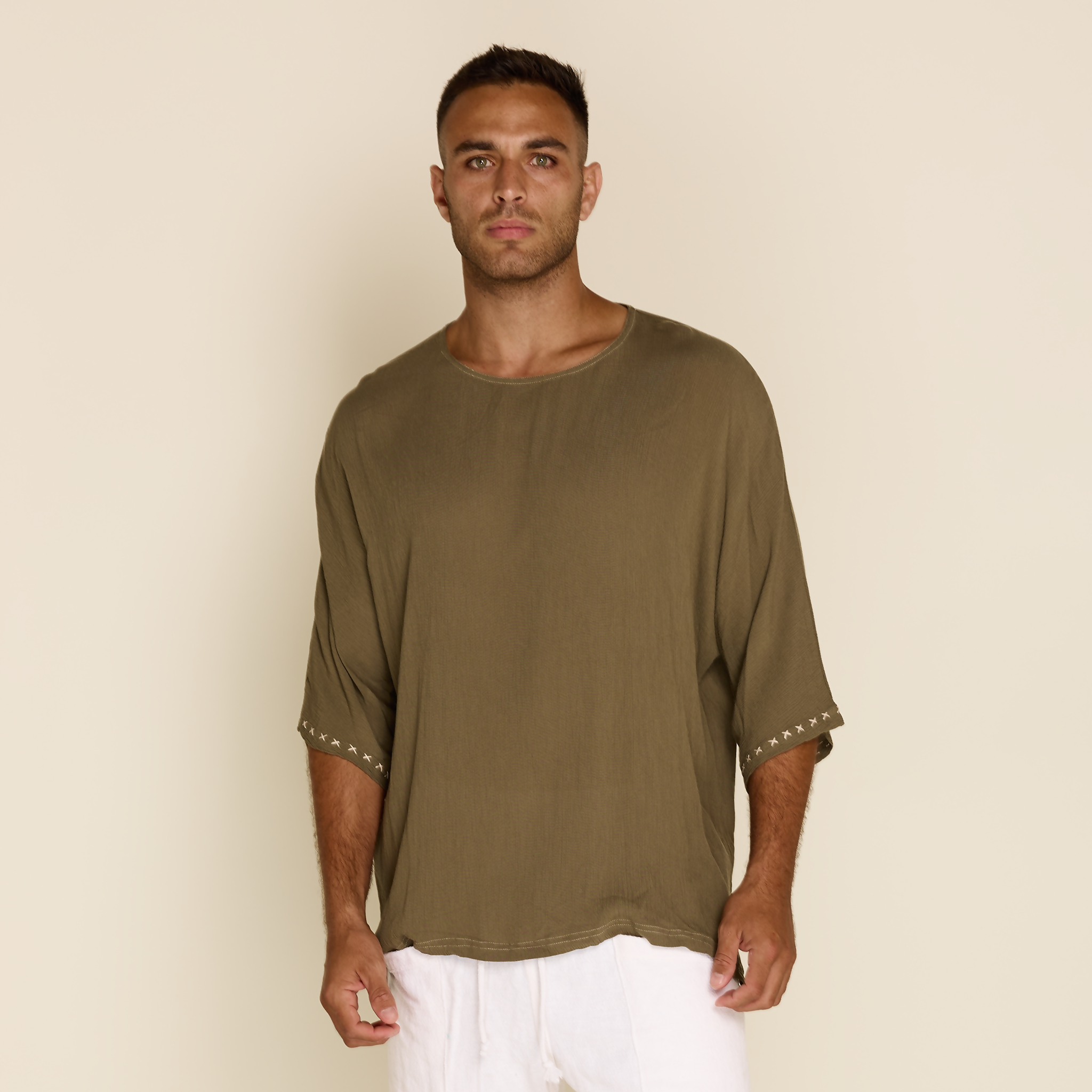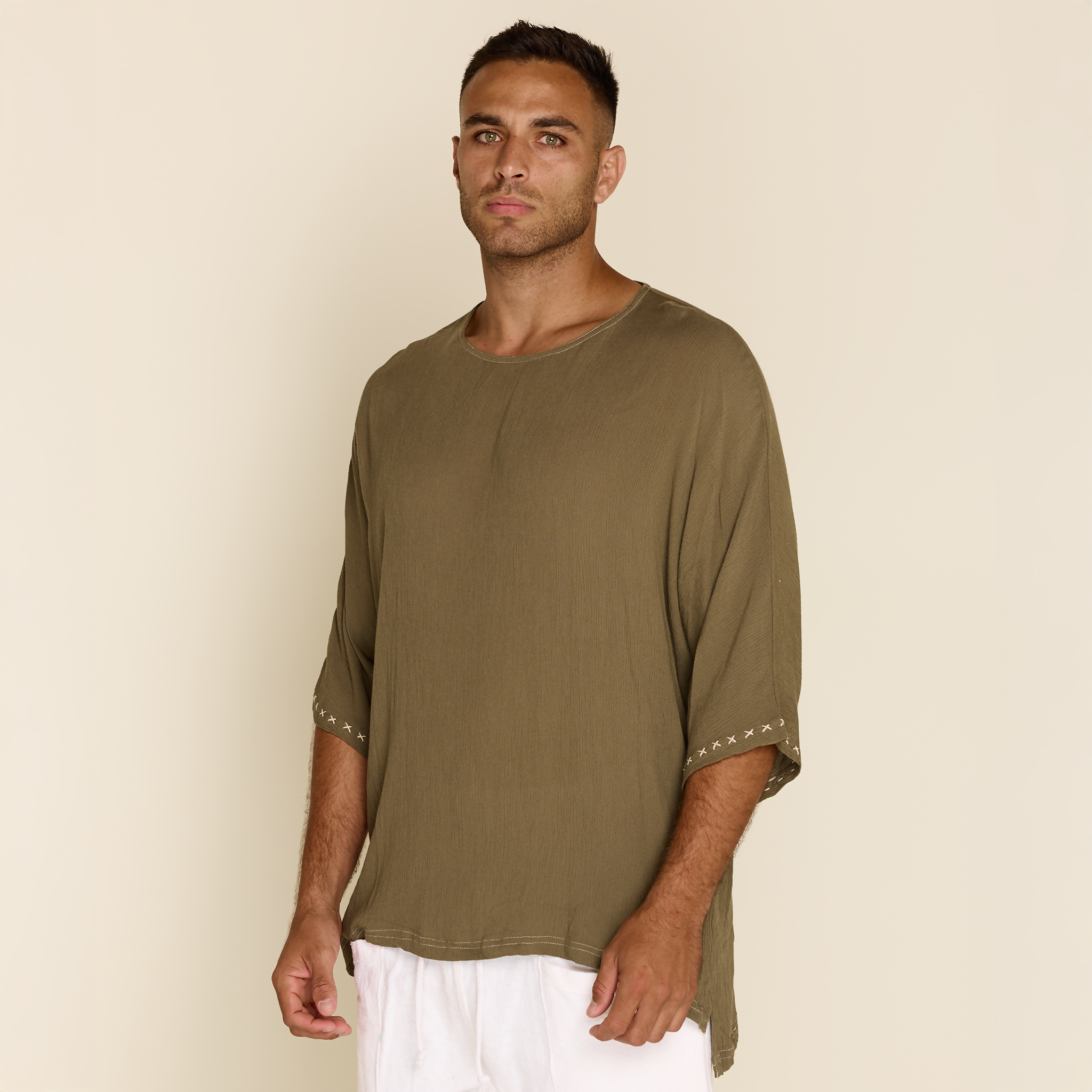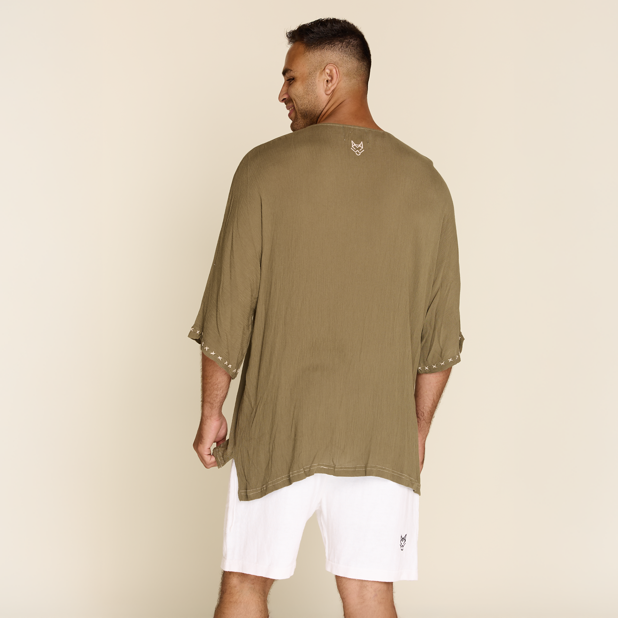 Beautiful and unique hand embroidered hemp cotton and rayon blend , assuring you a breathable lightweight sweat-free experience.