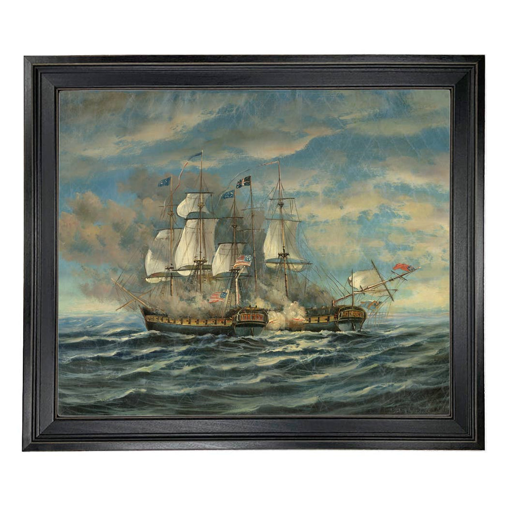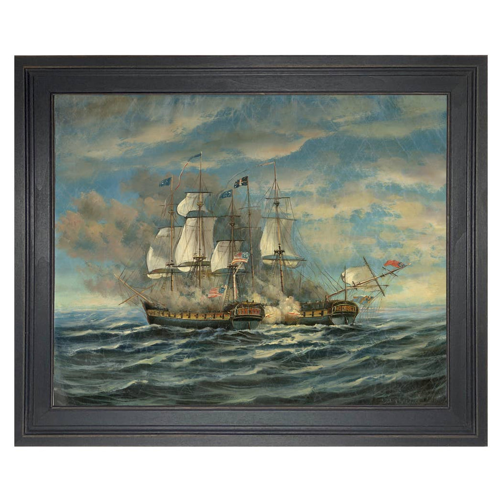 Accurate reproduction of the original oil painting by English-American painter Thomas Birch (1779-1851), this antiqued painting reproduction is printed on canvas, mounted to a board and treated with an historic looking varnish. Framed in a distressed black wood frame, the back is finished with 100% recycled craft paper and a wire or sawtooth hanger.