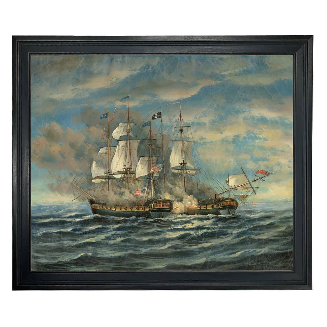 Accurate reproduction of the original oil painting by English-American painter Thomas Birch (1779-1851), this antiqued painting reproduction is printed on canvas, mounted to a board and treated with an historic looking varnish. Framed in a distressed black wood frame, the back is finished with 100% recycled craft paper and a wire or sawtooth hanger.