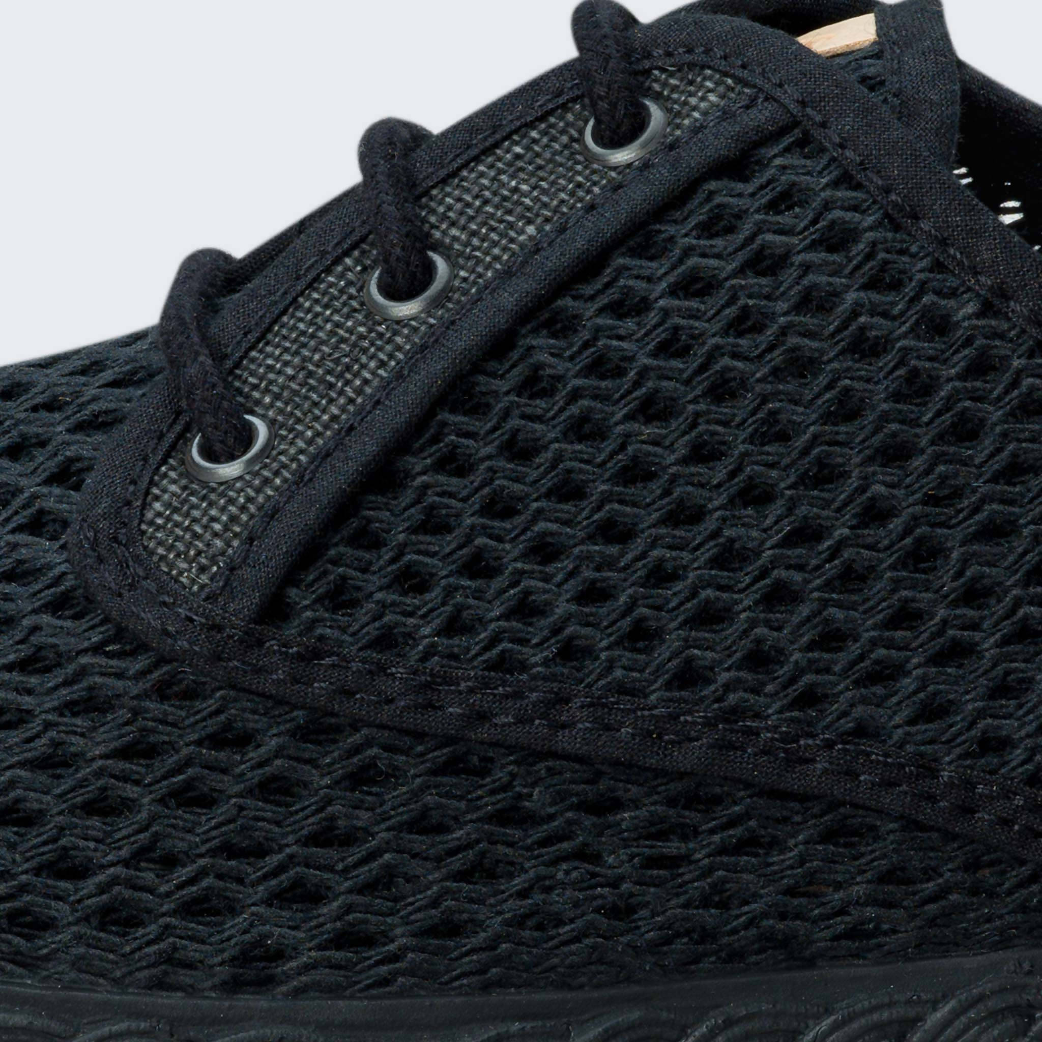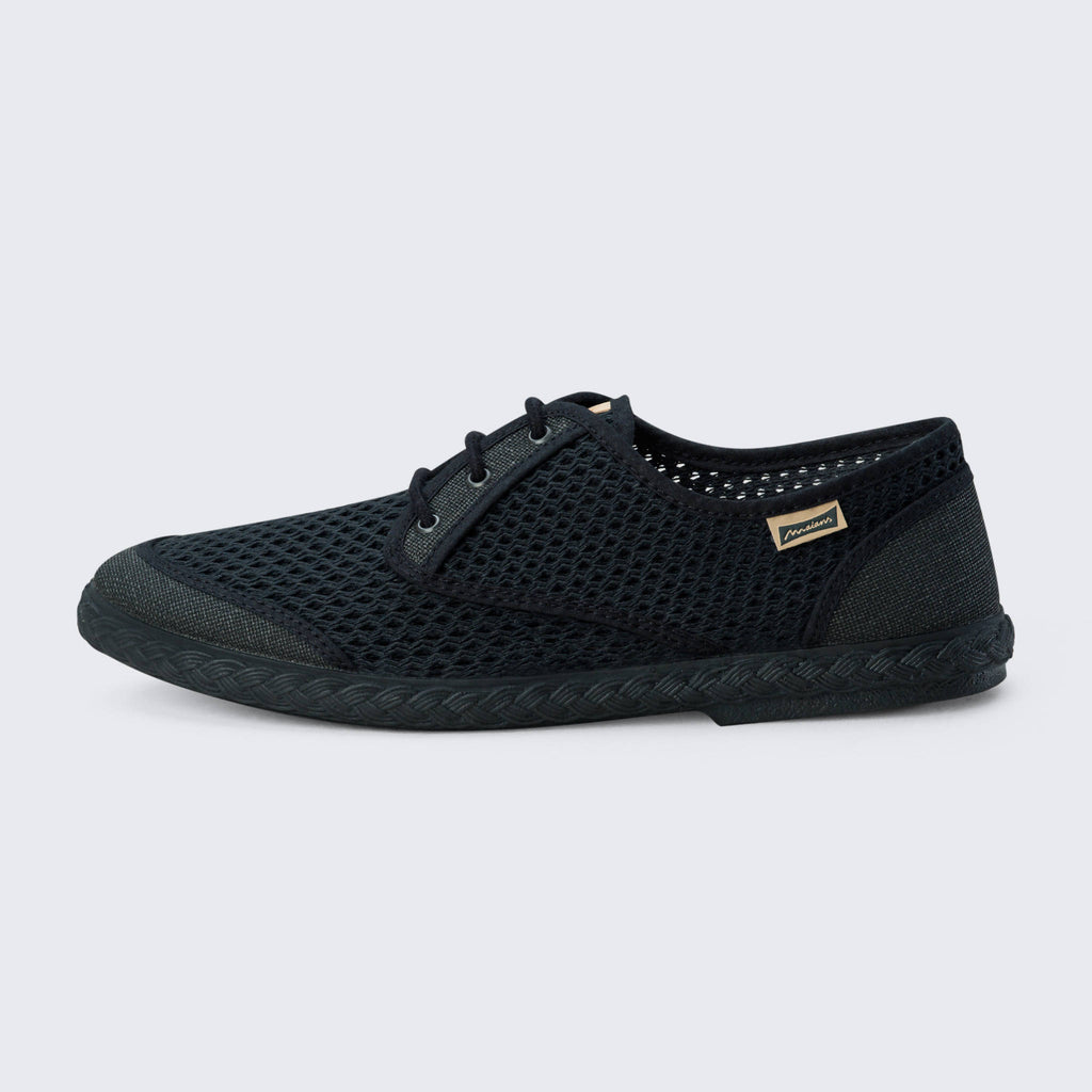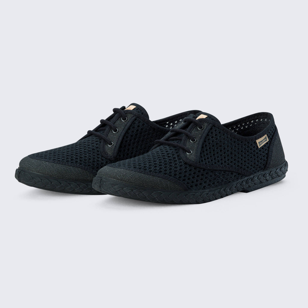 100% hand-crafted in La Rioja Spain in our partner´s small, family owned factory. Mesh cotton upper lace up with natural rubber vulcanized sole.  Black tone on tone upper on black, rubber soles.