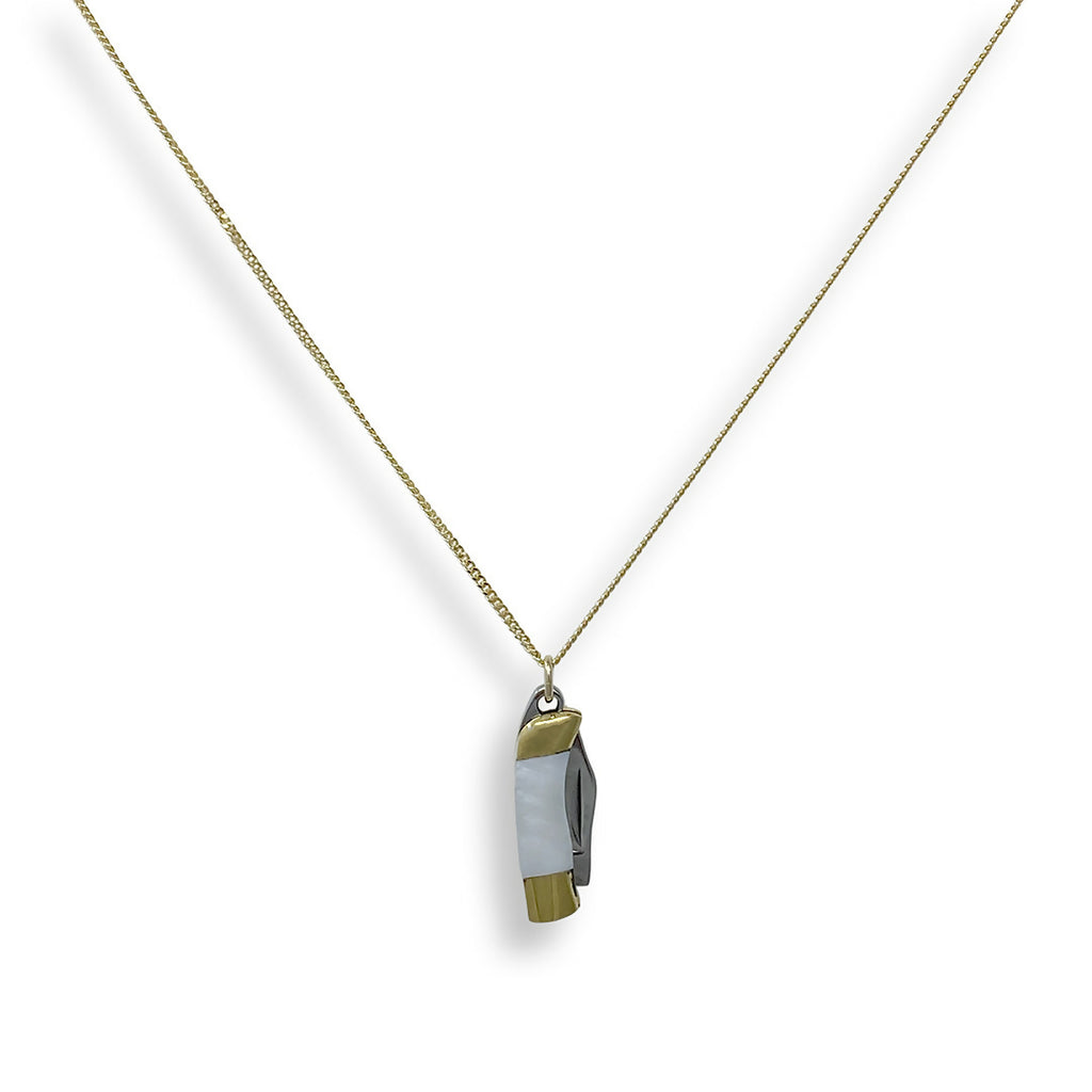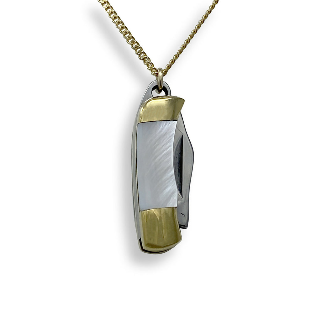 A tiny pearl handled folding knife with a sharp blade on a gold or aged brass chain.